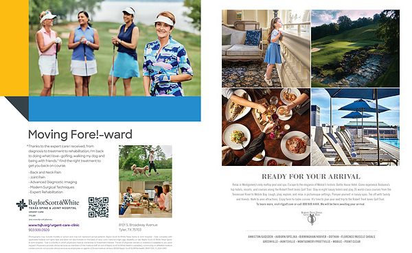 Relax in Montgomery’ s only rooftop pool and spa. Escape to the elegance of Mobile’ s historic Battle House Hotel. Come experience Alabama’ s top hotels, resorts, and courses along the Robert Trent Jones Golf Trail. Stay in eight luxury hotels and play 26 world-class courses from the Tennessee River to Mobile Bay. Laugh, play, explore, and relax in picturesque settings. Pamper yourself in luxury spas. Tee off with family and friends. Walk to area attractions. Enjoy farm-to-table cuisine. It’ s time to plan your next trip to the Robert Trent Jones Golf Trail. To learn more, visit rtjgolf. com or call 800.949.4444. We will be here awaiting your arrival.