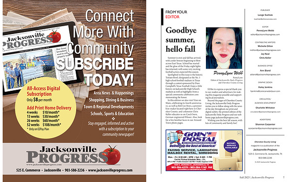Cherokee County Living magazine is a publication of the Jacksonville Progress 525 E. Commerce St, Jacksonville, TX 903-586-2236 © 2025 Jacksonville Progress