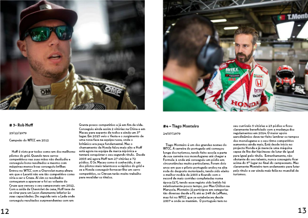Tiago Monteiro é um dos grandes nomes do WTCC. A carreira do português até começou longe dos turismos, tendo feito escola e parte da sua carreira nos monolugares até chegar a Formula 1 onde até conseguiu um pódio em circunstâncias muito particulares. Foram dois anos em que o piloto português andou na alta roda do desporto motorizado, tendo sido eleito o melhor rookie de 2005 e ficando com o record de mais corridas completadas numa época (17), tendo esse registo sido batido há relativamente pouco tempo, por Max Chilton na Marussia. Monteiro já participou em categorias tão diversas desde a F1 até as 24H de LeMans, mas foi no WTCC que se estabeleceu desde 2007 e onde se mantém. O português tem no seu currículo 5 vitórias e 23 pódios e ficou claramente beneficiado com a mudança dos regulamentos em 2014. O maior apoio aerodinâmico deve ter feito lembrar os tempos dos monolugares e o seu ritmo competitivo aumentou ainda mais. Está desde inicio no projecto Honda e já merecia uma máquina capaz de lhe dar hipóteses de lutar de igual para igual pelo título. Estranhamente, não obstante do seu talento, nunca conseguiu ficar acima do 5º lugar no final do campeonato. Mas claramente Monteiro tem andamento para lutar pelo titulo e ser ainda mais feliz no mundial de turismos.