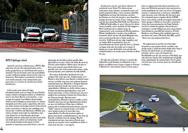 2015 foi uma boa colheira para o WTCC. Não terá sido um ano tão entusiasmante como todos gostaríamos ao nível desportivo pois o domínio Citroen foi mais uma vez avassalador e mais nenhuma equipa venceu tanto como os franceses. Mas tivemos excelentes corridas, com muita emoção, num campeonato que percorreu os 4 cantos do mundo, por pistas fantásticas.
