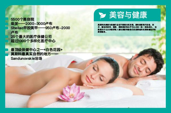 莫斯科的美容与保健行业在不断增长和发展 。 拥有崭新现代设备 、 技 术 、 建设的诊所 、 医院 、 美容美发和水疗中心正在一批一批地成立 。 这 就是为什么众多俄罗斯人都去莫斯科做他们负担得起的优质保健治疗和 美容服务 。