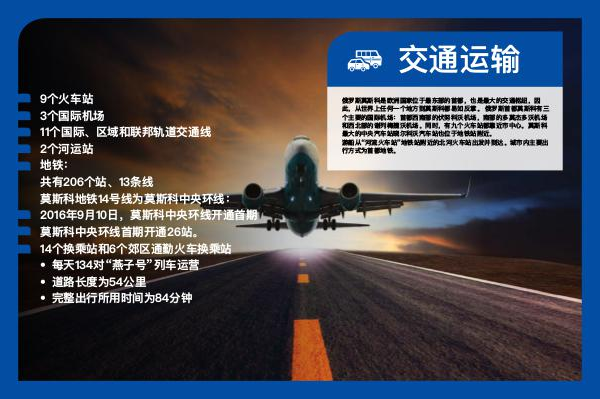 9个火车站 3个国际机场 11个国际、区域和联邦轨道交通线 2个河运站 地铁: 共有206个站、13条线 莫斯科地铁14号线为莫斯科中央环线: 2016年9月10日,莫斯科中央环线开通首期 莫斯科中央环线首期开通26站。 14个换乘站和6个郊区通勤火车换乘站 • 每天134对“燕子号”列车运营 • 道路长度为54公里 • 完整出行所用时间为84分钟