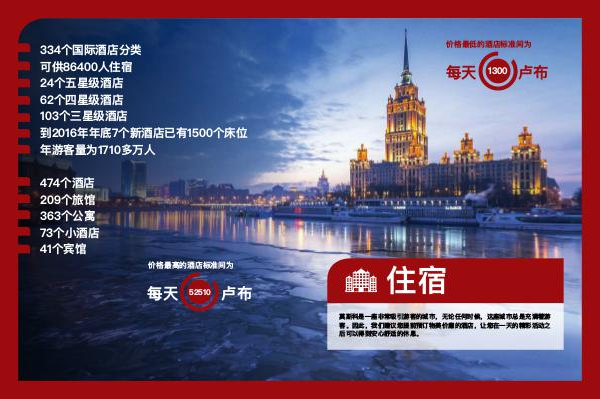 334个国际酒店分类 可供86400人住宿 24个五星级酒店 62个四星级酒店 103个三星级酒店 到2016年年底7个新酒店已有1500个床位 年游客量为1710多万人 474个酒店 209个旅馆 363个公寓 73个小酒店 41个宾馆 价格最高的酒店标准间为 每天 52510 卢布