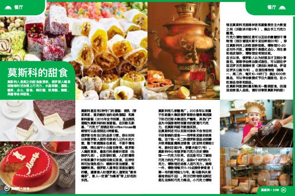 馆在莫斯科克里姆林宫和基督救世主大教堂 之间( 沃勒洪卡街 9 号), 展出手工巧克力 雕塑 。 巧克力博物馆附近是可以互动的蜜糖饼干博 物馆( 别尔谢涅夫斯卡亚沿岸街 20 号), 穿 过莫斯科河上的牧首桥即是 。 博物馆 10-20 点对外开放 。 蜜糖饼干是俄式点心, 用生姜 和桂皮制作, 博物馆设有培训班 。 自古以来, 俄罗斯人认为好朋友才互相分享 面包 。 要想学会烤出俄式面包, 可以前往伊 兹迈罗沃克里姆林宫( 游击队地铁站, 伊兹 迈罗沃公路 73 号) 。 在面包博物馆( 除周 一 、 周二外, 每天 10-18 开门) 展出 1000 件 展品, 可以学会做俄式节日大圆面包, 在小 吃部品尝茶和甜品 。 在莫斯科旅游时最好购买一整袋甜食, 回国 送给家里人品尝 。 请好好享受莫斯科的甜!