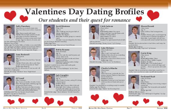 Class: Freshman Age: 14 Likes: Dry wall, the smell of paint, and various other scents Dislikes: Wet paint, hardwood, threelegged amphibians Ideal date: Exploring under a bridge with some radishes Fun Fact: I couldn’ t tie my shoe until fourth grade Zodiac sign: Ford Fusion Favorite love song:“ A New Hallelujah,” by Mr. Dean DiPiero