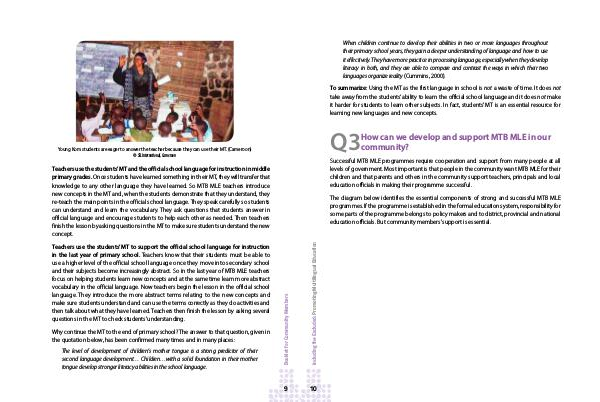 Teachers use the students’ MT and the official school language for instruction in middle primary grades. Once students have learned something in their MT, they will transfer that knowledge to any other language they have learned. So MTB MLE teachers introduce new concepts in the MT and, when the students demonstrate that they understand, they re-teach the main points in the official school language. They speak carefully so students can understand and learn the vocabulary. They ask questions that students answer in official language and encourage students to help each other as needed. Then teachers finish the lesson by asking questions in the MT to make sure students understand the new concept.