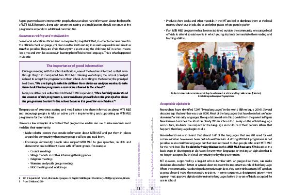 The purpose of awareness raising and mobilization is to share information about MTB MLE and encourage people to take an active part in implementing and supporting an MTB MLE programme for their children.