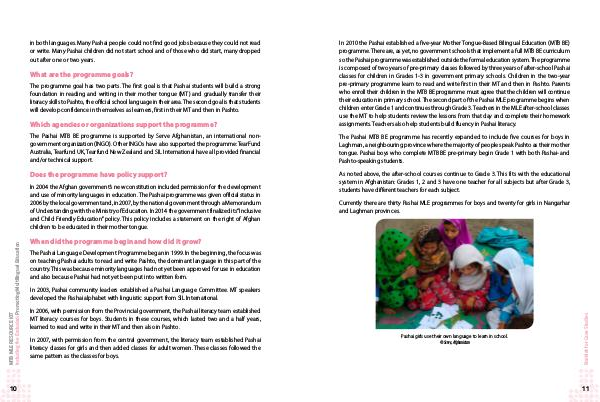 In 2010 the Pashai established a five-year Mother Tongue-Based Bilingual Education( MTB BE) programme. There are, as yet, no government schools that implement a full MTB BE curriculum so the Pashai programme was established outside the formal education system. The programme is composed of two years of pre-primary classes followed by three years of after-school Pashai classes for children in Grades 1-3 in government primary schools. Children in the two-year pre-primary programme learn to read and write first in their MT and then in Pashto. Parents who enroll their children in the MTB BE programme must agree that the children will continue their education in primary school. The second part of the Pashai MLE programme begins when children enter Grade 1 and continues through Grade 3. Teachers in the MLE after-school classes use the MT to help students review the lessons from that day and complete their homework assignments. Teachers also help students build fluency in Pashai literacy.