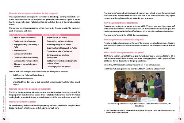 Since 2012, 1000 Pashai girls and boys have enrolled in pre-primary classes. In 2009 the Pashai programme was awarded UNESCO’ s Confucius Literacy Prize. 6