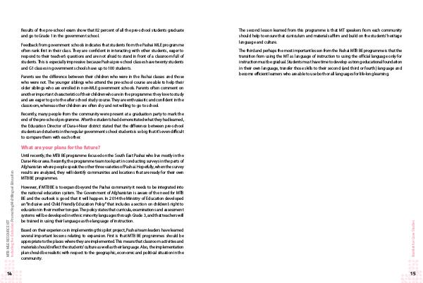 The third and perhaps the most important lesson from the Pashai MTB BE programme is that the transition from using the MT as language of instruction to using the official language only for instruction must be gradual. Students must have time to develop a strong educational foundation in their own language, transfer those skills to their second( and third or fourth) language and become efficient learners who are able to use both or all languages for life-long learning.