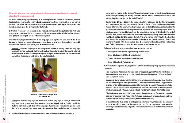 same writing system. So the students’ foundation in reading and writing Rajbanshi prepares them to begin reading and writing Nepali in Grade 1, Term 2. Students continue oral and written Nepali as a subject to the end of Grade 5.