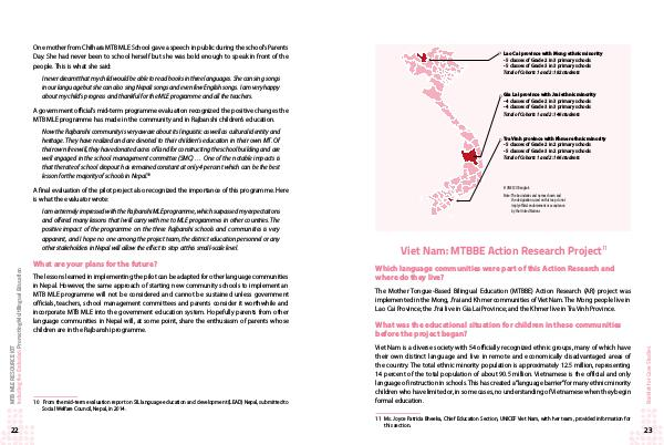 The Mother Tongue-Based Bilingual Education( MTBBE) Action Research( AR) project was implemented in the Mong, J’ rai and Khmer communities of Viet Nam. The Mong people live in Lao Cai Province; the J’ rai live in Gia Lai Province; and the Khmer live in Tra Vinh Province.