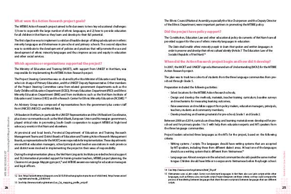 The MTBBE Action Research project aimed to find answers to two key educational challenges: 1) how to cope with the large number of ethnic languages; and 2) how to provide education for all children in Viet Nam so they learn and develop to their full potential.