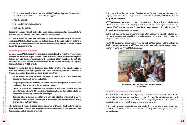 RCEME staff visited MTBBE schools and provided technical support as needed. MOET officials from the Ethnic Minority Education Pre-school and Primary Education Departments and selected MTBBE curriculum and materials developers also participated in the school visits and provided technical input to MTBBE teachers and school principals.