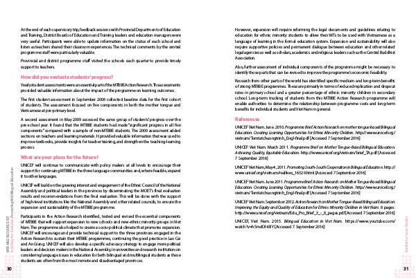UNICEF Viet Nam. June 2011. Programme Brief. Action Research on Mother Tongue-Based Bilingual Education. Creating Learning Opportunities for Ethnic Minority Children. http:// www. unicef. org / vietnam / Tomtatchuongtrinh _ Engl-final. pdf [ Accessed 7 September 2016 ]
