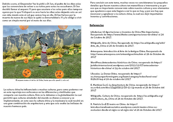 Wikipedia. Cultura de China. recuperado de https://es.wikipedia.org/wiki/Cultura_de_China el 26 de Octubre del 2017.