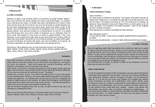 Pendant ce séjour, nous sommes partis à la recherche du garde forestier disparu! Nous nous sommes vite rendus compte qu’ il avait en fait été kidnappé! Le ravisseur nous a demandé une rançon: un herbier avec plein d’ échantillons de la nature! Nous nous sommes donc vite mis à l’ œuvre car nous avions besoin du garde forestier pour lire une carte mystérieuse que nous avions reçue. Après avoir réussi à faire un bel herbier, nous sommes allés à la rencontre du kidnappeur pour le lui remettre. Et là, grande surprise: nous sommes tombés sur un extraterrestre, un vrai fou! Il ne parlait pas notre langue donc nous avons utilisé un traducteur sur un ordinateur. Nous lui avons remis notre herbier et nous avons pu libérer le garde forestier! Pour nous remercier, il nous a aidés à lire cette carte et nous avons découvert un beau coffre au trésor plein de surprises! Souvenez-vous de Vamos à la playa, du cache-cache géant, du super Fort Boyard, de la belle toile peinte, des cours de théâtre, de la piscine, de l’ excursion des petits, de cette super bataille d’ eau, des danses de fous,…