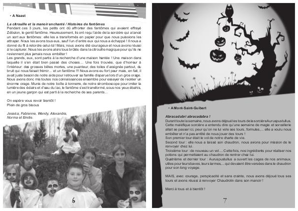 La citrouille et la manoir enchanté / Histoires de fantômes Pendant ces 3 jours, les petits ont dû affronter des fantômes qui avaient effrayé Zébulon, le gentil fantôme. Heureusement, ils ont reçu l’ aide de la sorcière qui a lancé un sort aux fantômes: elle les a transformés en papier pour que nous puissions les attraper. Nous les avons tous eus, sauf l’ un d’ entre eux qui nous a échappé! Il nous a donné du fil à retordre celui-là! Mais, nous avons été courageux et nous avons réussi à le capturer. Nous les avons alors tous brûlés dans la citrouille magique pour qu’ ils ne reviennent plus jamais nous embêter! Les grands, eux, sont partis à la recherche d’ une maison hantée! Une maison dans laquelle il s’ en était bien passé des choses … Une fois trouvée, que d’ horreur à l’ intérieur: des grosses bêtes mortes, une puanteur, des toiles d’ araignée partout, du bruit qui nous faisait frémir … et un fantôme!!! Nous avons eu fort peur mais, en fait, il avait juste besoin de notre aide pour retrouver sa famille disparue lors d’ un gros orage. Nous avons donc mis toutes nos connaissances ensemble pour essayer de recréer un énorme orage. Munis de notre boîte à tonnerre, de notre stromboscope pour imiter la lumière des éclairs et d’ eau du lac, le fantôme s’ est transformé, sous nos yeux ébahis, en un jeune garçon qui est parti à la recherche de ses parents...