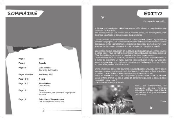 Voilà donc que l’ année deux mille douce s’ en est allée, laissant la place à cette année deux mille treize animée … Très animée puisque COALA fêtera ses 25 ans cette année, une année rythmée, donc de rendez-vous festifs et de nouveautés de circonstance.