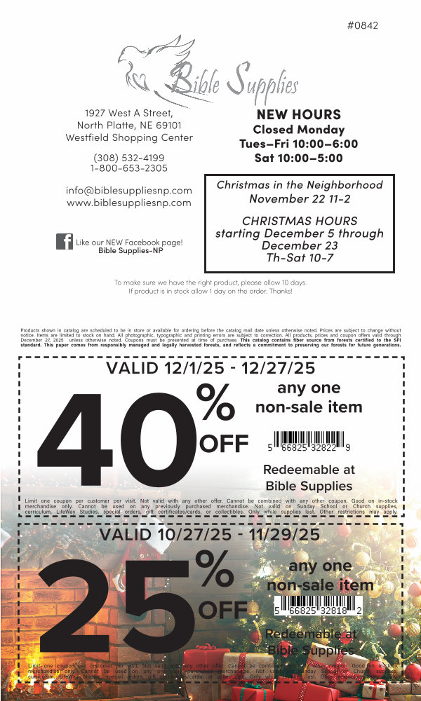Limit one coupon per customer per visit. Not valid with any other offer. Cannot be combined with any other coupon. Good on in-stock merchandise only. Cannot be used on any previously purchased merchandise. Not valid on Sunday School or Church supplies,