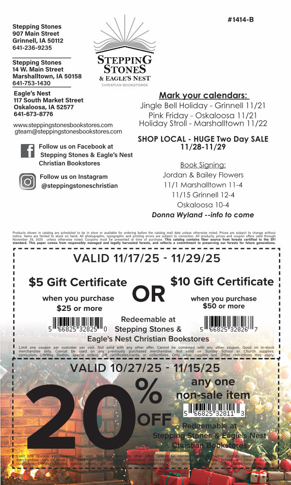 Follow us on Facebook at Stepping Stones & Eagle’ s Nest Christian Bookstores