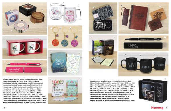A Metal Keyring : Be Strong & Courageous | 9 x 2cm , gift tin | 561585 NO KE $ 17.99 B Blessed Man Bookmark | Jeremiah 17:7 , faux leather , 15 x 5.6cm | 560741 STY BM $ 9.99 C Blessed Man Journal | zip closure , 336 pages , 22 x 16.3cm | 560739 STY JL $ 29.99 D Blessed Man Wallet | genuine leather , 2-section bi-fold , 11 x 9cm | 560742 PP AC $ 49.99 E Box Of Blessings : 101 Favourite Bible Verses For Men | 51 cards | 305510 GE PB $ 9.99 F Box Of Blessings : Promises From God For Every Man | 50 cards | 527861 GE PB $ 9.99 G Retractable Ballpoint Pen : Man Of God | 1 Timothy 6:11 | 508625 STY WR $ 12.99 H Black Ceramic Mug : Stand Firm | 1 Corinthians 15:58 , 532mL | 565967 DKW MG $ 17.99 I Black Ceramic Mug : Faith | Matthew 19:26 , 532mL | 565969 DKW MG $ 17.99 J Black Ceramic Mug : Strength | Joshua 1:9 , 532mL | 565968 DKW MG $ 17.99 K My Dad , My Hero Gift Set | 444mL ceramic mug , metal keyring | 564670 GE GE $ 29.99