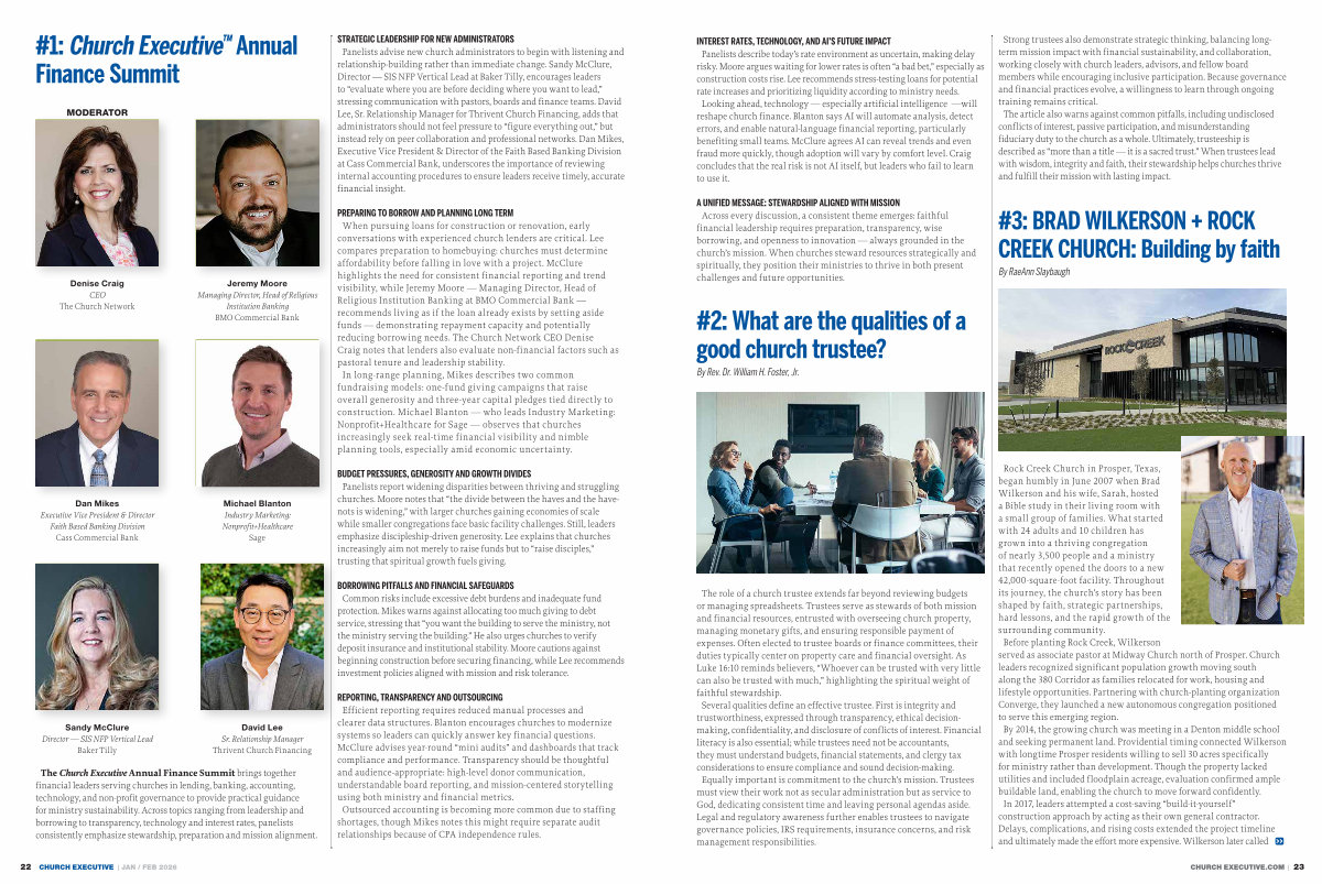Strong trustees also demonstrate strategic thinking, balancing longterm mission impact with financial sustainability, and collaboration, working closely with church leaders, advisors, and fellow board members while encouraging inclusive participation. Because governance and financial practices evolve, a willingness to learn through ongoing training remains critical. The article also warns against common pitfalls, including undisclosed conflicts of interest, passive participation, and misunderstanding fiduciary duty to the church as a whole. Ultimately, trusteeship is described as“ more than a title— it is a sacred trust.” When trustees lead with wisdom, integrity and faith, their stewardship helps churches thrive and fulfill their mission with lasting impact.