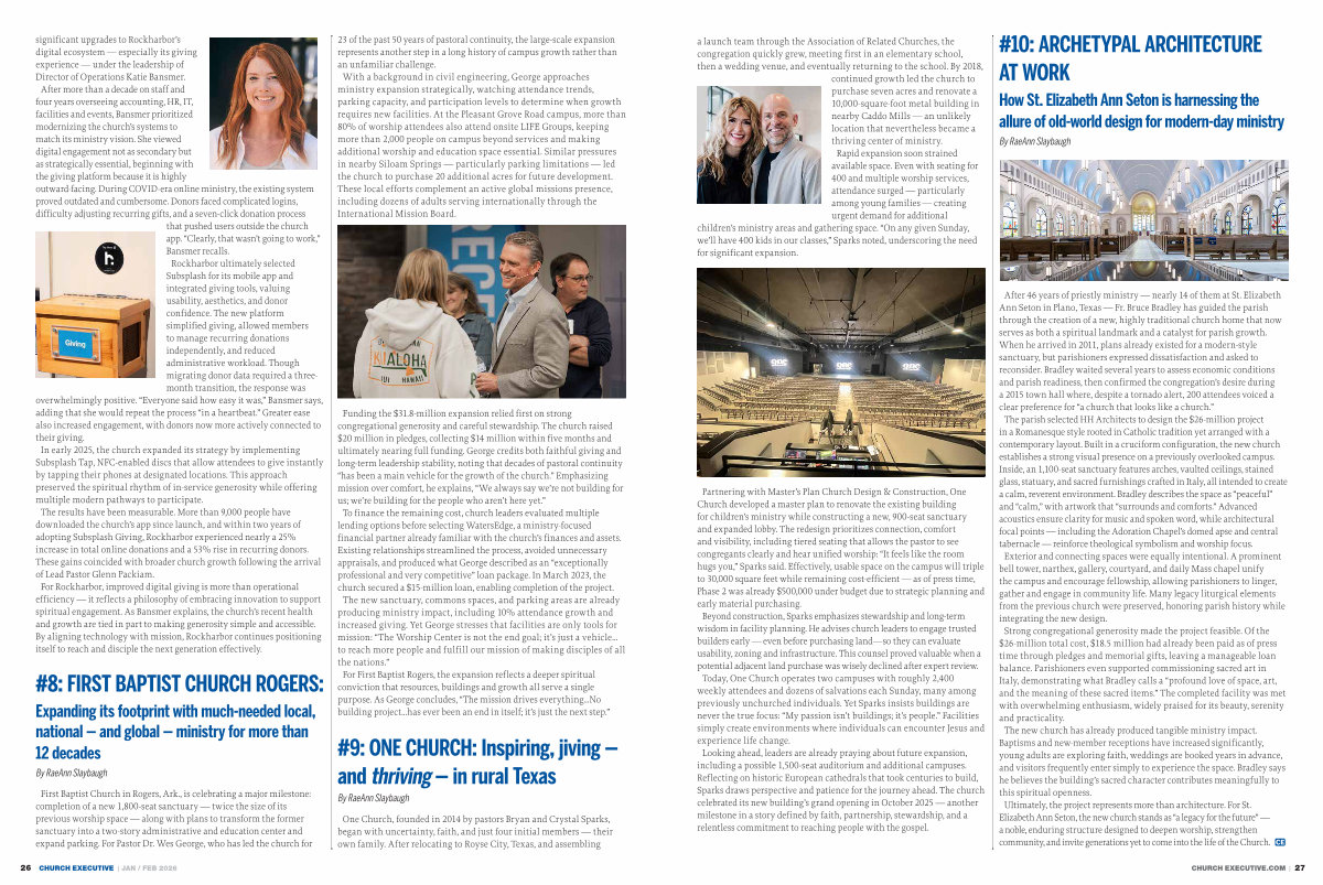 Partnering with Master’ s Plan Church Design & Construction, One Church developed a master plan to renovate the existing building for children’ s ministry while constructing a new, 900-seat sanctuary and expanded lobby. The redesign prioritizes connection, comfort and visibility, including tiered seating that allows the pastor to see congregants clearly and hear unified worship:“ It feels like the room hugs you,” Sparks said. Effectively, usable space on the campus will triple to 30,000 square feet while remaining cost-efficient— as of press time, Phase 2 was already $ 500,000 under budget due to strategic planning and early material purchasing. Beyond construction, Sparks emphasizes stewardship and long-term wisdom in facility planning. He advises church leaders to engage trusted builders early— even before purchasing land— so they can evaluate usability, zoning and infrastructure. This counsel proved valuable when a potential adjacent land purchase was wisely declined after expert review. Today, One Church operates two campuses with roughly 2,400 weekly attendees and dozens of salvations each Sunday, many among previously unchurched individuals. Yet Sparks insists buildings are never the true focus:“ My passion isn’ t buildings; it’ s people.” Facilities simply create environments where individuals can encounter Jesus and experience life change. Looking ahead, leaders are already praying about future expansion, including a possible 1,500-seat auditorium and additional campuses. Reflecting on historic European cathedrals that took centuries to build, Sparks draws perspective and patience for the journey ahead. The church celebrated its new building’ s grand opening in October 2025— another milestone in a story defined by faith, partnership, stewardship, and a relentless commitment to reaching people with the gospel.