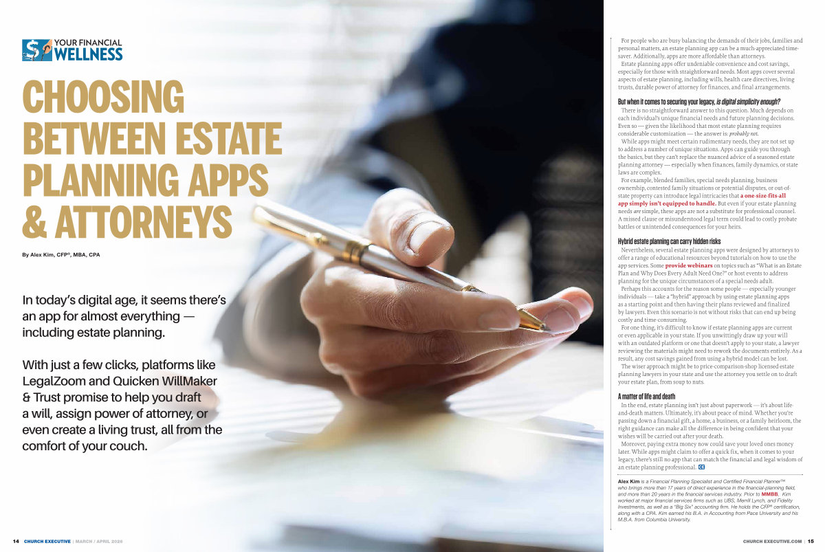 In the end, estate planning isn’ t just about paperwork— it’ s about lifeand-death matters. Ultimately, it’ s about peace of mind. Whether you’ re passing down a financial gift, a home, a business, or a family heirloom, the right guidance can make all the difference in being confident that your wishes will be carried out after your death. Moreover, paying extra money now could save your loved ones money later. While apps might claim to offer a quick fix, when it comes to your legacy, there’ s still no app that can match the financial and legal wisdom of an estate planning professional.