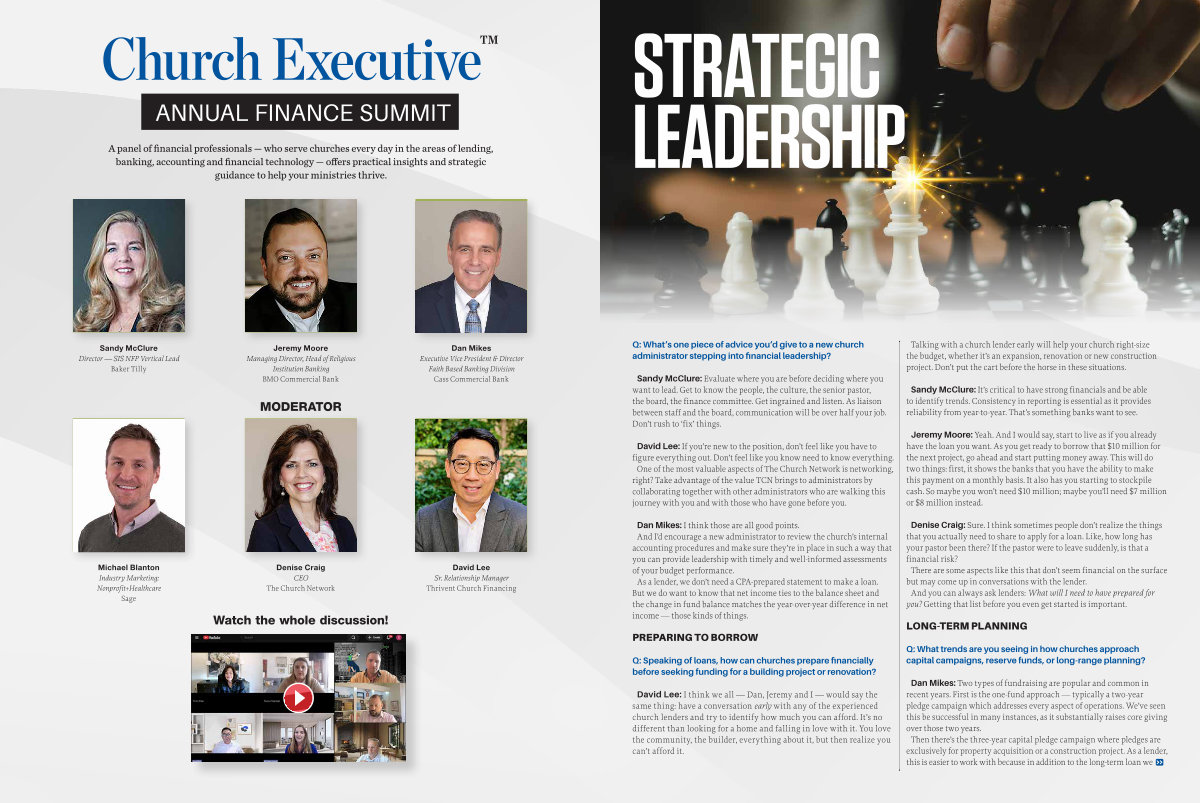 A panel of financial professionals— who serve churches every day in the areas of lending, banking, accounting and financial technology— offers practical insights and strategic guidance to help your ministries thrive.