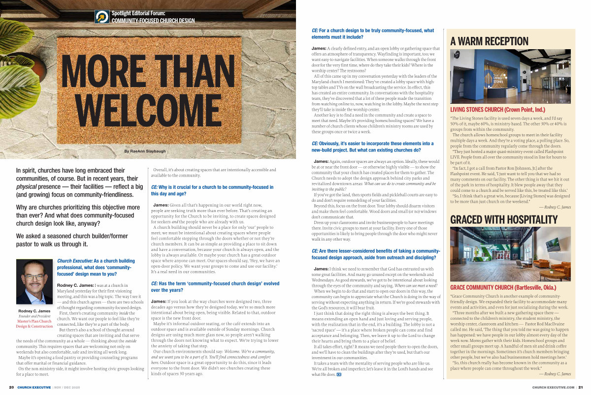 Rodney C. James: I was at a church in Maryland yesterday for their first visioning meeting, and this was a big topic. The way I see it— and this church agrees— there are two schools of thought regarding community-focused design. First, there’ s creating community inside the church. We want our people to feel like they’ re connected, like they’ re a part of the body. But there’ s also a school of thought around creating spaces that are inviting and that serve the needs of the community as a whole— thinking about the outside community. This requires spaces that are welcoming not only on weekends but also comfortable, safe and inviting all week long. Maybe it’ s opening a food pantry or providing counseling programs that offer marital or financial guidance. On the non-ministry side, it might involve hosting civic groups looking for a place to meet.