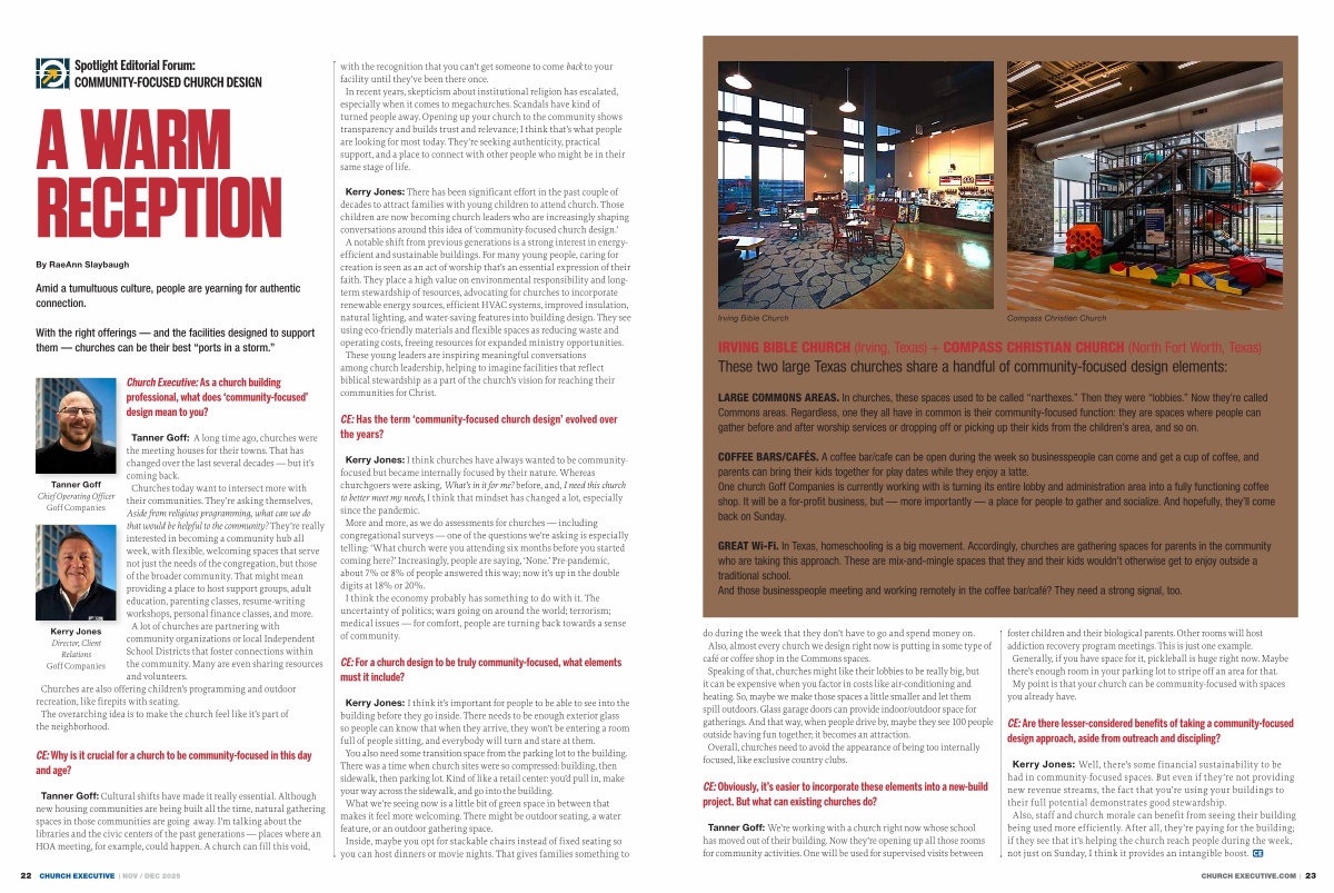 Tanner Goff: Cultural shifts have made it really essential. Although new housing communities are being built all the time, natural gathering spaces in those communities are going away. I’ m talking about the libraries and the civic centers of the past generations— places where an HOA meeting, for example, could happen. A church can fill this void, with the recognition that you can’ t get someone to come back to your facility until they’ ve been there once. In recent years, skepticism about institutional religion has escalated, especially when it comes to megachurches. Scandals have kind of turned people away. Opening up your church to the community shows transparency and builds trust and relevance; I think that’ s what people are looking for most today. They’ re seeking authenticity, practical support, and a place to connect with other people who might be in their same stage of life.