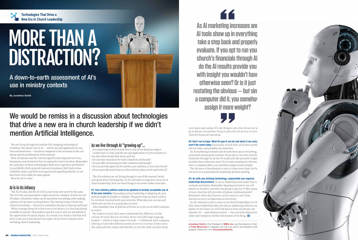Jonathan Smith is the President of MBS, Inc. and the Director of Technology at Faith Ministries in Lafayette, Ind. He is an author and frequent conference speaker. Follow him on X @ JonathanESmith.