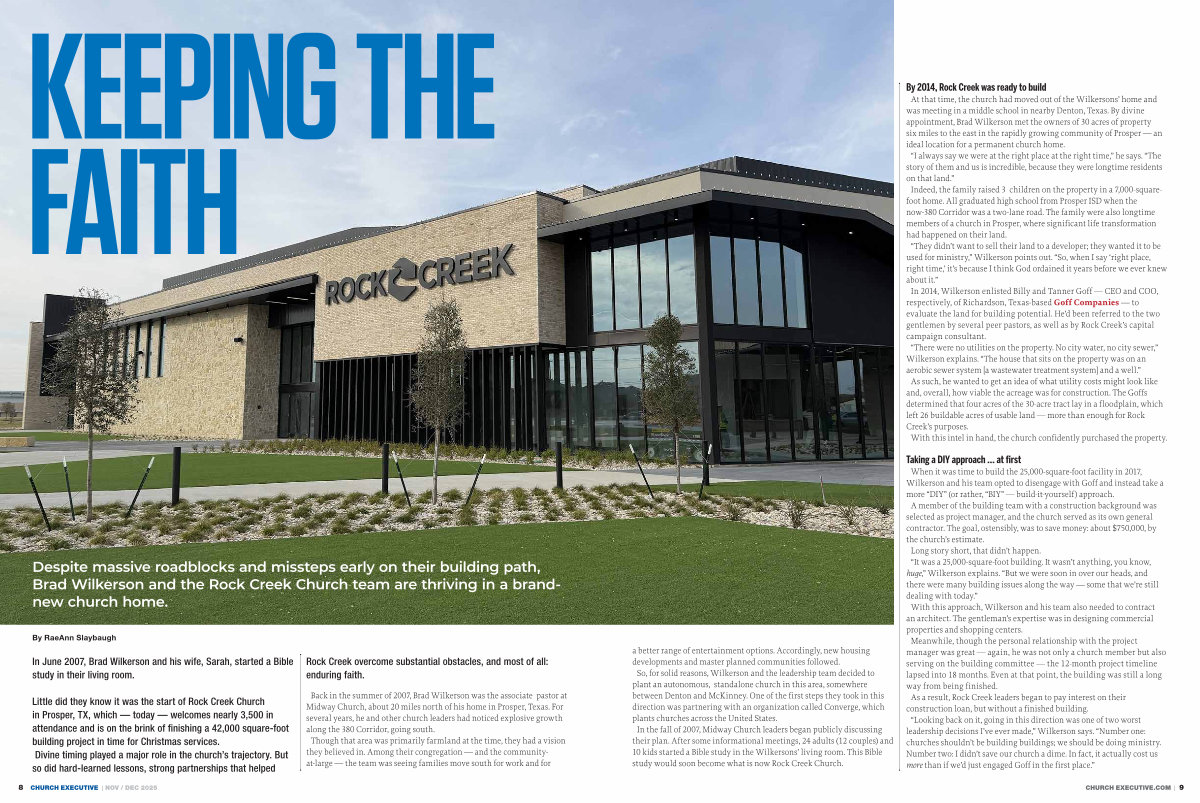 By 2014, Rock Creek was ready to build At that time, the church had moved out of the Wilkersons’ home and was meeting in a middle school in nearby Denton, Texas. By divine appointment, Brad Wilkerson met the owners of 30 acres of property six miles to the east in the rapidly growing community of Prosper— an ideal location for a permanent church home.“ I always say we were at the right place at the right time,” he says.“ The story of them and us is incredible, because they were longtime residents on that land.” Indeed, the family raised 3 children on the property in a 7,000-squarefoot home. All graduated high school from Prosper ISD when the now-380 Corridor was a two-lane road. The family were also longtime members of a church in Prosper, where significant life transformation had happened on their land.“ They didn’ t want to sell their land to a developer; they wanted it to be used for ministry,” Wilkerson points out.“ So, when I say‘ right place, right time,’ it’ s because I think God ordained it years before we ever knew about it.” In 2014, Wilkerson enlisted Billy and Tanner Goff— CEO and COO, respectively, of Richardson, Texas-based Goff Companies— to evaluate the land for building potential. He’ d been referred to the two gentlemen by several peer pastors, as well as by Rock Creek’ s capital campaign consultant.“ There were no utilities on the property. No city water, no city sewer,” Wilkerson explains.“ The house that sits on the property was on an aerobic sewer system [ a wastewater treatment system ] and a well.” As such, he wanted to get an idea of what utility costs might look like and, overall, how viable the acreage was for construction. The Goffs determined that four acres of the 30-acre tract lay in a floodplain, which left 26 buildable acres of usable land— more than enough for Rock Creek’ s purposes. With this intel in hand, the church confidently purchased the property. a better range of entertainment options. Accordingly, new housing developments and master planned communities followed. So, for solid reasons, Wilkerson and the leadership team decided to plant an autonomous, standalone church in this area, somewhere between Denton and McKinney. One of the first steps they took in this direction was partnering with an organization called Converge, which plants churches across the United States. In the fall of 2007, Midway Church leaders began publicly discussing their plan. After some informational meetings, 24 adults( 12 couples) and 10 kids started a Bible study in the Wilkersons’ living room. This Bible study would soon become what is now Rock Creek Church.
