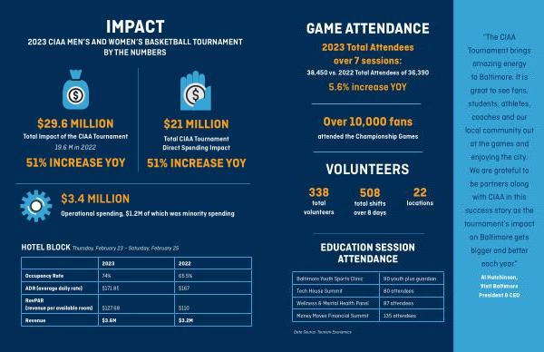 The positive stories of students and fans attending the 2022 tournament in Baltimore were the basis for an engaging video to promote the tournament to those thinking about attending in 2023 . This travel sentiment video sharing peer-to-peer experiences of the CIAA ’ s first year in Baltimore was distributed to all of the CIAA schools and our local community . This video provided peace-of-mind and grassroots support to the marketing efforts leading up to this year ’ s tournament . The video can be viewed here . Organic Social Media • Visit Baltimore reached more than 67,950 Instagram accounts through organic posting 10