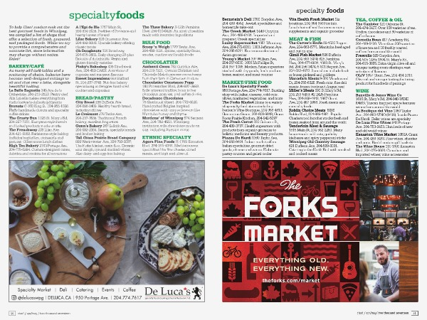 De Luca’ s Specialty Foods 950 Portage Ave, 204‐774‐7617. Bustling shop with Italian cheeses, cold cuts, olives, marinated vegetables, and more The Forks Market Home to a variety of specialty food stores including: Fenton’ s Wine Boutique, 204-956-4613; Generation Green, 204‐808‐9848; Grass Roots Prairie Kitchen, 204‐942‐5097 The Fresh Carrot 230 Osborne St, 204-489-3737. Health superstore with products from organic groceries to holistic medicine and beauty products. Piazza De Nardi 1360 Taylor Ave, 204‐982‐9461. Indoor market offers Italian specialties, gourmet dried goods, cheese and wines. Elaborate pastry counter and gelati cooler specialty foods