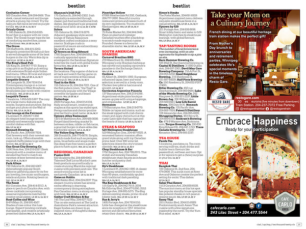 Cordova 93 Albert St, 204-691-1900. Europeaninfluenced tapas, beer and wine selection is served in a lively room. Chicken liver pâté is luscious and smooth. LP, IA, M, V Corrientes Argentine Pizzeria 137 Bannatyne Ave, 204‐219‐5398. Argentinean-style pizza boutique serves up pies with unique toppings, and empanadas. LP, SP, IA, M, V Hermanos 179 Bannatyne Ave, 204-219-0779. Nibble on tapas and mains, such as the steak topped with crab chevre cream and zippy chimichurri at this rustic Latin spot that has captured the hearts of many. LP, SP, A, IA, M, V