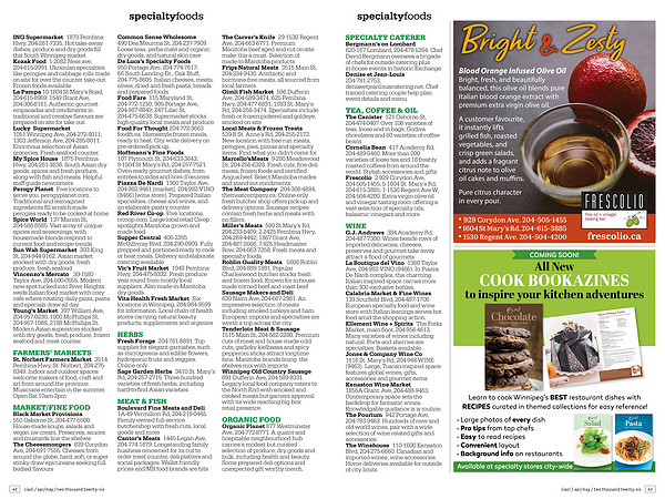 ING Supermarket 1873 Pembina Hwy, 204‐261‐7335. Hot take-away dishes, produce and dry goods fill this South Winnipeg market Kozak Food 1-2082 Ness ave, 204-615-9991. Ukrainian specialties like perogies and cabbage rolls made on-site for over the counter take-out. Frozen foods available La Pampa 10-1604 St Mary’ s Road, 204‐615‐8969; 1549 Grant Ave, 204-306-8161. Authentic gourmet empanadas and condiments in traditional and creative flavours are prepared on site for take out. Lucky Supermarket 1051 Winnipeg Ave, 204‐272‐8011; 1303 Jefferson Ave, 204‐285‐8011. Enormous selection of Asian groceries. Fresh seafood counter. My Spice House 1875 Pembina Hwy, 204‐261‐3636. South Asian dry goods, spices and fresh produce, along with fish and meats. Helpful staff guide newcomers Perogy Planet Five locations to serve you. perogyplanet. com. Traditional and reimagined ingredients fill scratch-made perogies ready to be cooked at home Spice World 137 Marion St, 204‐586-8585. Vast array of unique spices and seasonings, with housemade blends respond to current food and recipe trends Sun Wah Supermarket 303 King St, 204‐944‐9162. Asian market stocked with dry goods, fresh produce, fresh seafood Vincenzo’ s Mercato 30-1580 Taylor Ave, 204-500-0555. Modern new spot tucked into River Heights weds Italian food market with cozy cafe where rotating daily pizza, pasta and specials draw all day. Young’ s Market 397 William Ave, 204‐957‐0230, 1000 McPhillips St, 204‐957‐1088, 2188 McPhillips St. Modern Asian superstore stocked with dry goods, fresh produce, frozen seafood and meat counter