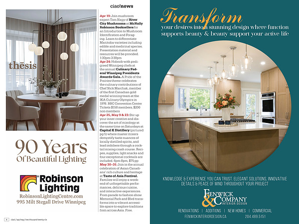 Apr 19: Join mushroom expert Tom Nagy of River City Mushrooms at McNally Robinson Booksellers for an Introduction to Mushroom Identification and Foraging. Learn to differentiate Manitoba varieties including edible and medicinal species. Presentation material and resources will be provided. 1:30pm-3:30pm Apr 24: Hobnob with pedigreed Winnipeg chefs at the annual Culinary Federal Winnipeg Presidents Awards Gala. A Pride of the Prairies theme celebrates the culinary contributions of Chef Nick Marchak, member of the first Canadian gold medal winning team at the IKA Culinary Olympics in 1976. RBC Convention Centre Tickets $ 150 members, $ 200 non-members Apr 25, May 9 & 23: Stir up your inner creative and discover the art of mixology at the same time on Saturdays at Capital K Distillery( pictured pg 5) where master mixers demystify taste nuances of locally distilled spirits, and lead imbibers through a cocktail mixing crash course. Recipes, supplies, light snacks and four exceptional cocktails are included. 6pm-8pm, $ 75 pp May 30 – 31: Join in the annual celebration of Asian Canadians’ rich culture and heritage at Taste of Asia Festival. Families will enjoy a weekend of unforgettable performances, delicious cuisine, and interactive experiences. From parade to fashion show Memorial Park and Blvd transforms into a vibrant accessible space to explore traditions from across Asia. Free.