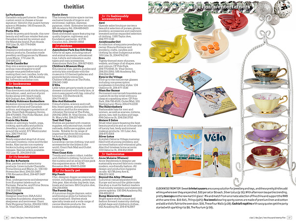 Assiniboine Park Zoo Gift Shop Gifts for all ages, including nature and animal souvenirs, educational toys, t-shirts and relaxation audio tapes and cozy accessories. Assiniboine Park Zoo, 204‐927‐6061 Children’ s Museum Shop Educational toys, games, puzzles and activity kits coordinate with the museum’ s 12 themed galleries and promote family interaction. Children’ s Museum at The Forks, 204‐943‐1449 D’ Ella Little tykes get party-ready in pretty dresses trimmed with lovely lace, or mini-tuxes paired with big, colourful bowties. 155 Sherbrook St, 204‐774‐4019 Kite And Kaboodle Colourful kites, science and craft kits, board games, and puzzles offer education and fun for everyone. Johnston Terminal at The Forks, 204‐942‐2800; St. Vital Centre, 1225 St. Mary’ s Rd, 204‐257‐4595 Toad Hall Toys Shelves are packed with creative supplies, educational toys, model railroads, dollhouse supplies, and books. Notable for its range of imported toys from 50 countries. 54 Arthur St, 204‐956‐2195 Trendy Tots Local shop carries clothing, toys and accessories for the littles in the world, Grant Park Mall and Outlet Collection West Coast Kids Trendy and modern infant, toddler and children’ s clothing, furniture for the nursery and an array of toys pack this expansive store. 4-1290 Kenaston Blvd, 204-615-2288