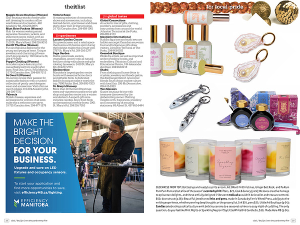CLOCKWISE FROM TOP: Bottled up and ready to spritz a room, All I Want Fir Christmas, Ginger Bell Rock, and Pa Rum Pum Pum Pum are but a few of the season’ s scented spirit lifters, $ 25, Coal & Canary( p 24); We love a creative homage to epicurean delights, and these artfully designed iridescent mollusks couldn’ t be lovelier and treasure centred. $ 50, dconstruct( p 28); Beautiful jewel toned inks and pens, made in Canada by Ferris Wheel Press, add joy to the writing experience, whether penning deep thoughts or the grocery list. Ink $ 35, pens $ 25, Little Art Boutique( p 24); Candles celebrating cocktail culture emit delicious aroma to a seasonal soirée or a cozy night of cuddling. The only question, do you feel like Mint Mojito or Sparkling Negroni? by Little White Bird Candle Co, $ 30, Made Here MB( p 24).