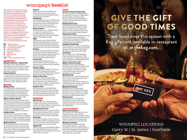Across the Board Game Café 211 Bannatyne Ave, 204‐691‐3422. Choose from more than 1,000 board games to play, or simply enjoy snacks, sandwiches and delicious entrées in this bright and bustling space. LP, IA, M, V Buffalo Stone Café 1961 McCreary Rd, 204-989‐8370. Relax lakeside at FortWhyte Alive. Hearty sandwiches, soups and a signature bison burger make this a sweet nature setting. WA, SP, IA, M, V Clementine Café 123 Princess St, 204‐942‐9497. Trendy underground nook gives haute cuisine flair to simple breakfast and lunch dishes like Belgian waffles and eggs benedict. LP, A, IA, M, V Joe Black Coffee Bar 2037 Portage Ave, 204‐415‐1660. Mod café serves up lunch fare and sinfully delicious desserts from Chocolate Zen Bakery. WA, LP, SP, IA, M, V, ATM Juneberry 531 St. Mary’ s Rd., 204-306-8838. Friendly daytime spot in St. Vital with a gorgeous interior and a menu featuring Asian and Middle Eastern inspired dishes. WA, IA, M, V Modern Electric Lunch 232 Main Street, 204-306-6404. Contemporary takes on classic diner fare in historic, newly renovated Fortune Block. The savory waffle with gouda dipping sauce is a highlight. WA, LP, A, IA, M, V The Oakwood 660 Osborne St, 204‐475‐4250. Sleek decor and a commitment to local sourcing elevates this neighbourhood favourite. Twists on comfort food and indulgent desserts are top picks. WA, LP, A, IA, M, V