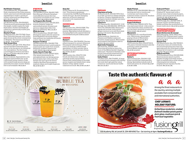 Homer’ s 520 Ellice Ave, 204-788‐4858. Grecian pillars transport to ancient Athens at this popular old world spot. With a menu of carefully crafted Greek specialties, it’ s little wonder this is the place has stood the test of time.