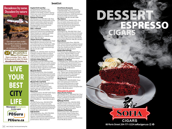 Oval Room Brasserie Fort Garry Hotel, 222 Broadway, 1-800-665-8088. This swish lounge boasts an opulent ceiling and live jazz performances, while the kitchen presents stellar scratch-made sensations. WA, LP, A, IA, M, V, ATM The Oxbow 557 Osborne St, 204-691-5373. This farm-to-table restaurant with an ever-changing menu focuses on seasonal ingredients like pickerel, beets, Arctic char and root vegetables. LP, A, IA, M, V Petit Socco 256 Stafford St, 204-306-7522. Chef Adam Donnelly provides an intimate dining experience for twelve guests per night. Expect an ever-changing menu feauring seasonal ingredients and exciting flavours. WA, LP, A, IA, M, V Rae’ s Bistro 9-925 Headmaster Row, 204-229- 0237. North Kildonan neighbourhood spot serves eclectic bistro fare. Don’ t miss the chalkboard list of creative daily features. WA, LP, IA, M, V Rudy’ s Eat & Drink 375 Graham Ave, MB Hydro Place, main floor, 204-421-9094. A mod steakhouse offerings, like steak frites. Lively atmosphere with a retro glam aesthetic. WA, LP, SP, A, IA, M, V Saddlery on Market 114 Market Ave, 204‐615‐1898. Twists on comfort food are presented in a chic Exchange District space, once the site of the Great West Saddlery Company. WA, LP, SP, IA, M, V Tabula Rasa 725 Osborne St, tabularasaosborne. com. Tapas spot evokes fresh ideas with old-world style. Paintings of matadors prepare palates for Mediterranean dishes. LP, A, IA, M, V Wood Tavern 112 Marion St, 204-235-6003. Cozy and cool restaurant inside the Norwood Hotel features a huge wood-fired grill that scents the sprawling space with a campfire like aroma. WA, LP, SP, IA, M, V
