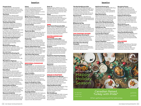 The Osborne Taphouse 112 Osborne St, 204-219-0477.“ The O” is an easy-going hang out located in a popular Village spot. Over 40 vodka varieties on tap, local brews and pub grub plus live music add a great vibe. LP, A, IA, M, V, ATM Park Alleys 730 Osborne St, 204-560-5067. Beloved South Osborne gathering place offers five pin bowling, live music and burgers, salads and pizza. Rotating beers on tap. LP, A, IA, M, V The Roost 651 Corydon Ave, 204‐414‐9313. A place to perch on Corydon Ave, with clever cocktails incorporating seasonal ingredients matched by creative small plates. LP, SP, A, IA, M, V Rosé Coffee and Wine B-474 Main St, 204-505-4567. Shades of rose define this sweet luxe lounge. Expect trending cocktails that sparkle, and creative artistically presented dishes. WA, LP, A, IA, M, V Shannon’ s Irish Pub 175 Carlton St, 204-943‐2302. Irish hospitality is extended through classic pub food and traditional Irish dishes, like shephard’ s pie prepared with ground lamb. LP, A, IA, M, V, ATM bestlist