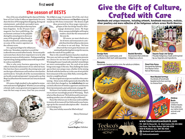 One of the joys of publishing this Special Holiday Issue of Ciao! is that it offers an opportunity for us to share the love of Winnipeg’ s best shopping, dining and entertainment – and refresh our readers’ memories of some of those places that may have been forgotten. In the 29 years Ciao! magazine has been publishing, the excitement continues to be palpable during this annual quest to showcase some of the great gift ideas found in locally owned stores, and shine a light on some of the creative superstars on the culinary scene.
