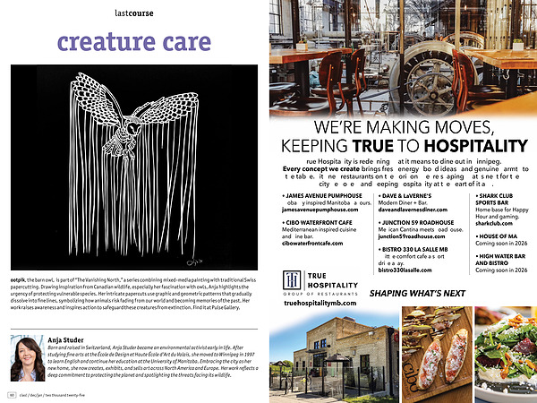 ootpik, the barn owl, is part of“ The Vanishing North,” a series combining mixed-media painting with traditional Swiss papercutting. Drawing inspiration from Canadian wildlife, especially her fascination with owls, Anja highlights the urgency of protecting vulnerable species. Her intricate papercuts use graphic and geometric patterns that gradually dissolve into fine lines, symbolizing how animals risk fading from our world and becoming memories of the past. Her work raises awareness and inspires action to safeguard these creatures from extinction. Find it at Pulse Gallery.