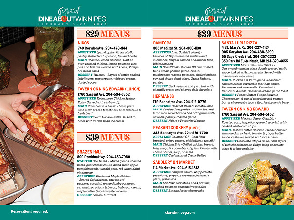 Reservations required. Prices are per person, excluding beverages, taxes & gratuity.