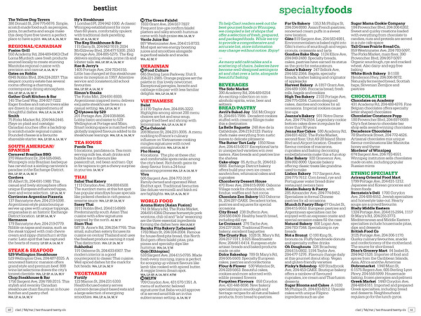 Sabai Thai Eatery 1113 Corydon Ave, 204‐888‐6508. The succinct menu at this hot spot has popular standbys house specials like pickerel cheeks in rich peanutsesame sauce. WA, LP, SP, IA, M, V Sassy Thai 3311 Roblin Blvd, 204-615-8989. Predominantly south Asian Thai cuisine with a few signatures inspired by the north. AI, M, V Siam Thai 587 St. Anne’ s Rd, 204-254‐7765. This small, suburban eatery focuses its cuisine on central Thailand and uses the freshest produce earning it royal Thai distinction. WA, LP, IA, M, V Sukhothai 191 Osborne St, 204-633‐6907. The modern interior is a good counterpoint to classic Thai cuisine. Well spiced dishes hit the mark for hot heads. WA, LP, IA, M, V
