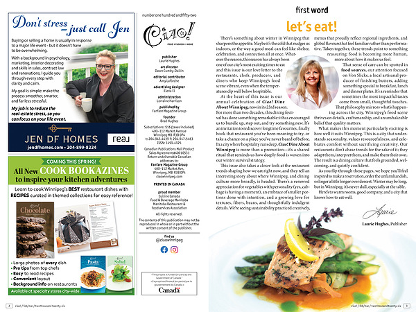At the heart of this issue is our annual celebration of Ciao! Dine About Winnipeg, now in its 23rd season. For more than two decades, this dining festival has done something remarkable: it has encouraged us to bundle up, step out, and try something new. It’ s an invitation to rediscover longtime favourites, finally book that restaurant you’ ve been meaning to try, or take a chance on a place you’ ve never heard of before. In a city where hospitality runs deep, Ciao! Dine About Winnipeg is more than a promotion— it’ s a shared ritual that reminds us how deeply food is woven into our winter survival strategy.